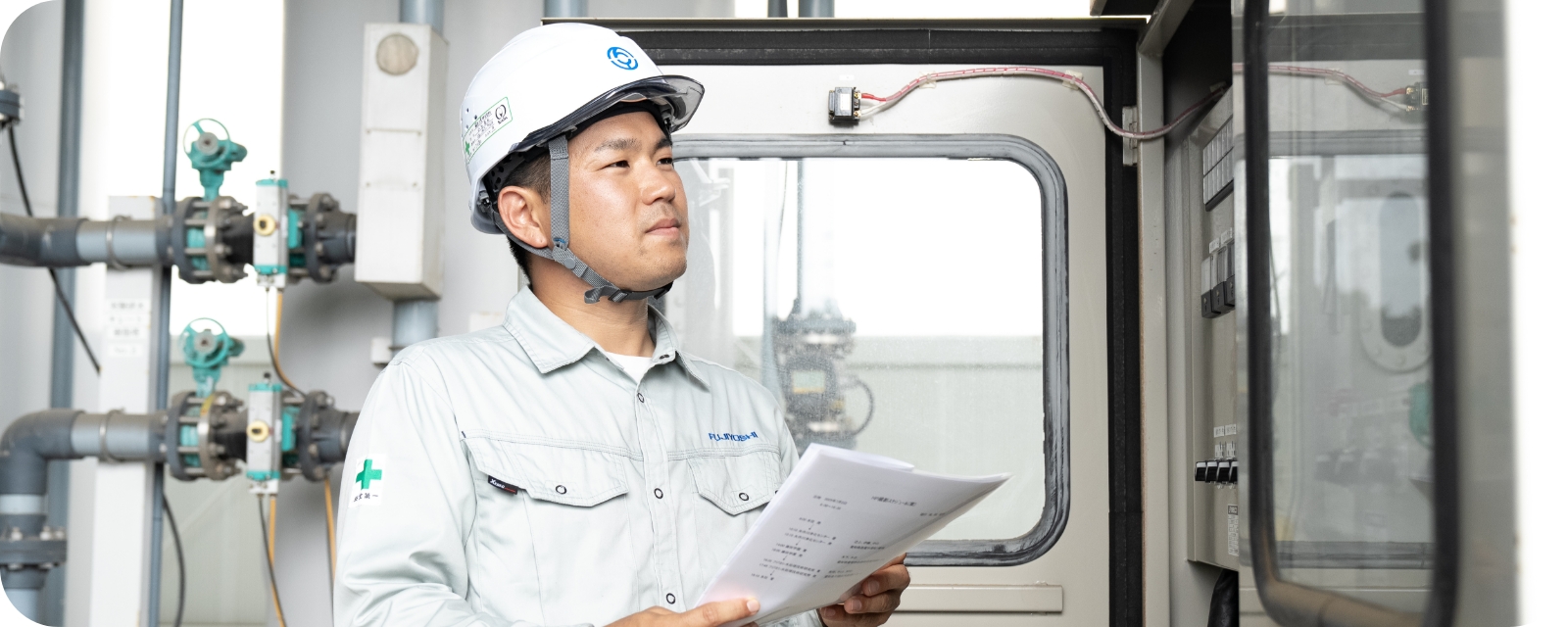 「排水処理施設や浄化槽は、汚水を浄化して排水基準を満たしたきれいな水にするのですが、排水処理施設完成後もずっと長い間、きれいな水にし続けなければなりません。私はその水質の維持管理と、水質を守っていくための設備自体の保全をしています」